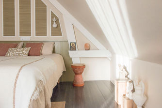 La présence de l'enduit texturé beige sur les murs ainsi que les accents de bois sur le sol et les meubles créent une ambiance chaleureuse et harmonieuse. Pour mettre en avant l'authenticité des lieux, divers objets chinés tels qu'un banc de ferme rustique, des colonnes sculptées en albâtre et des pots en terre cuite ont été intégrés, ajoutant une touche de personnalité à ces deux espaces. Dans le salon d'appoint, les lignes épurées des meubles se fondent harmonieusement avec les éléments chinés et les objets de famille.